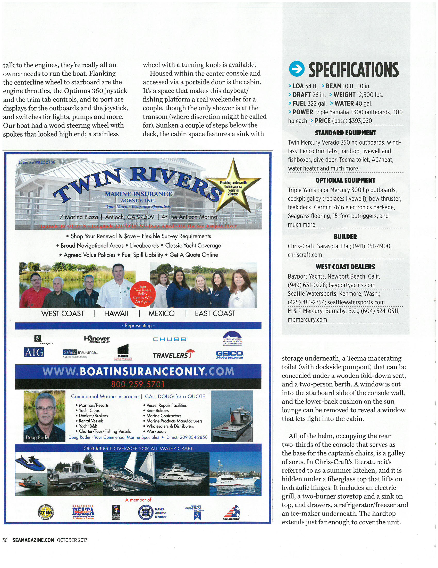 Nine-hundred horsepower. That’s the first feature to catch my eye as I approach the Chris-Craft Catalina 34 from the dock. It’s backed into its slip, so the triple Yamaha F300 outboards stand out, rumbling power plants that for the moment are silent, but ready. Strapped to the swim step of the Catalina 34, introduced a couple of years ago and the recent recipient of a new hardtop design with an extendable Sure Shade that works at the push of a button, those outboards might cause some folks who haven’t seen a Chris-Craft in a while to perform a double take to make sure they’re looking at a Chris-Craft, but they probably won’t second guess the performance.