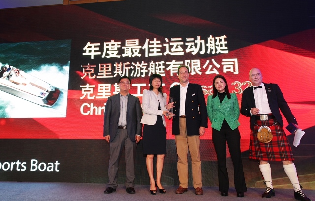 Shanghai, China – April, 2013: The new Corsair 34 wins top prize for Best Sport Boat at the Shanghai International Boat Show in Shanghai, China. It was officially announced at the 4th annual Asian Marine & Boating Awards Gala Dinner, held at the Intercontinental Expo Hotel in Pudong, in Shanghai. The Chris-Craft Corsair 34 won, Best Sport Boat, in one of the largest categories, beating out competitors such as the Riva Iseo 27. The Shanghai International Boat Show is the largest boat show in Asia with over 300 brands of boats showcased during the four day event from April 11-14, 2011.